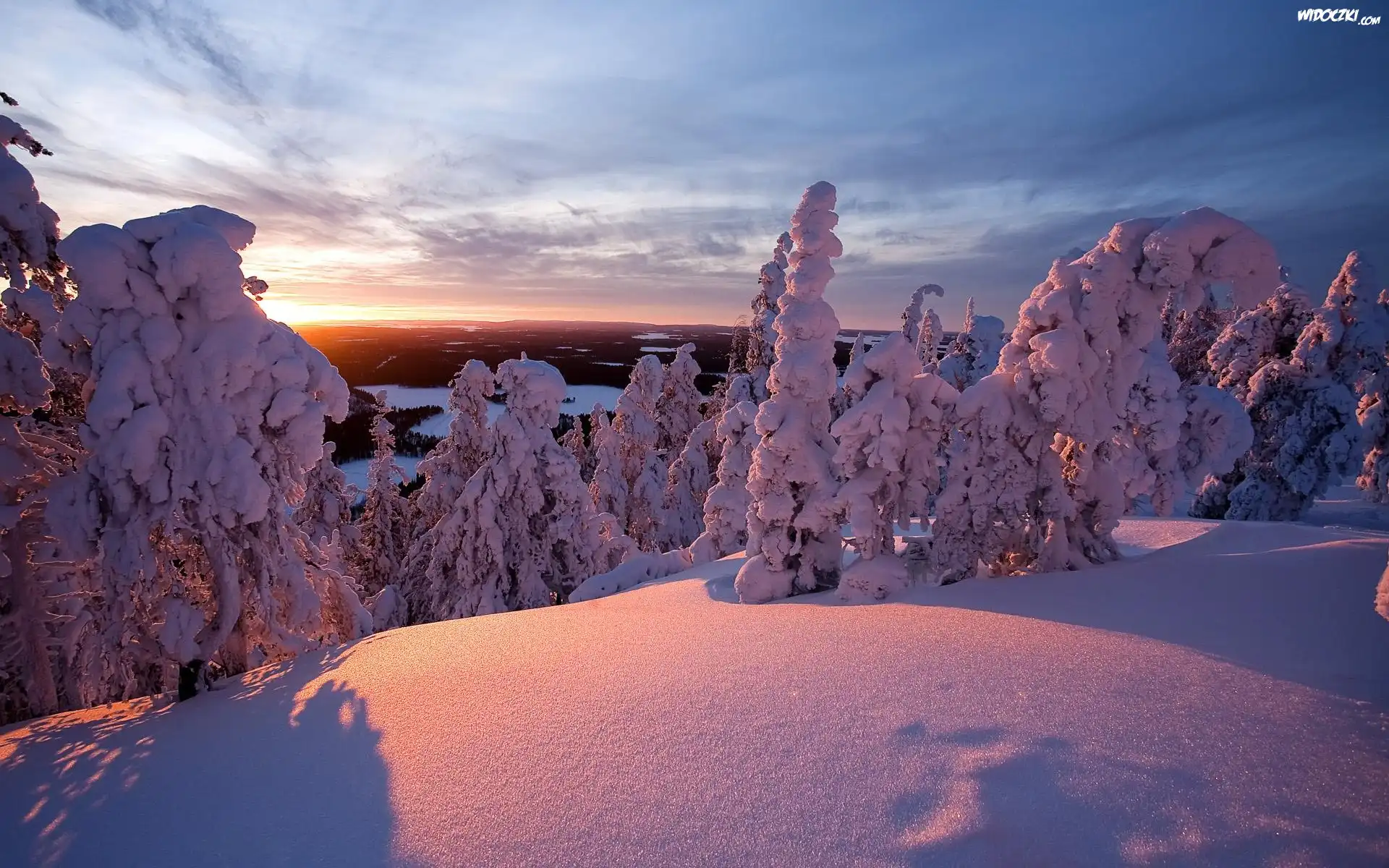 Zdjęcia, Zima, Ośnieżone, Drzewa, Zachód Słońca