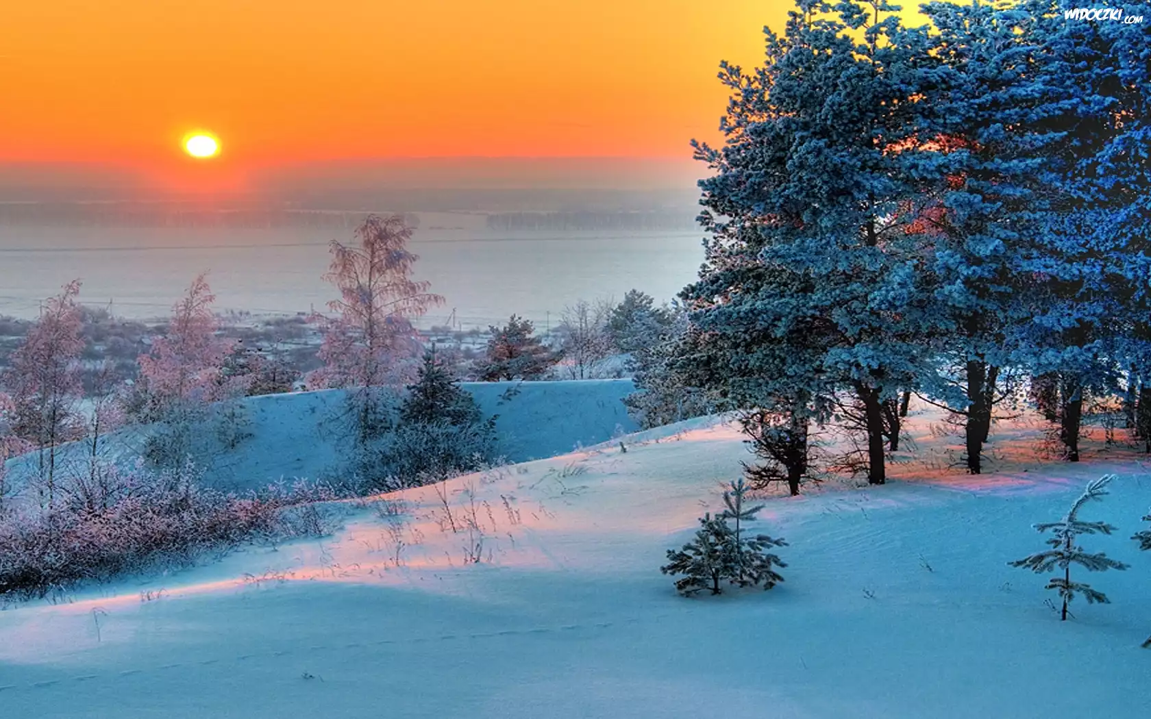 Zdjęcia, Zima, Drzewa, Zachód Słońca