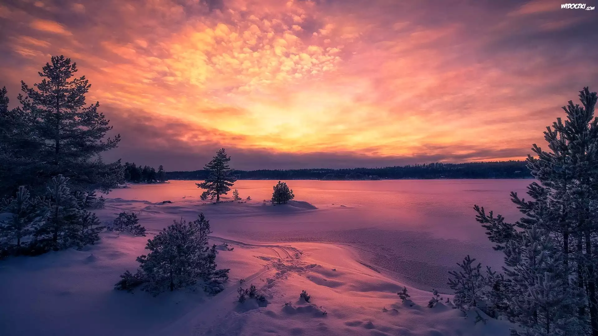 Zdjęcia, Zima, Drzewa, Zachód słońca