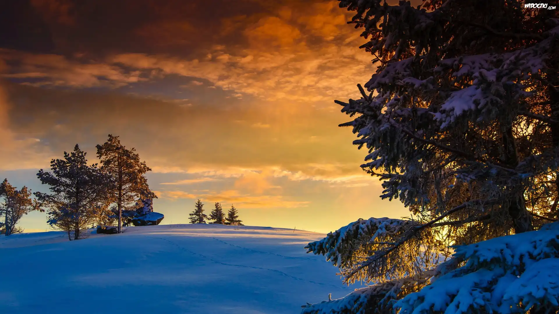 Zdjęcia, Zima, Drzewa, Zachód, Słońca