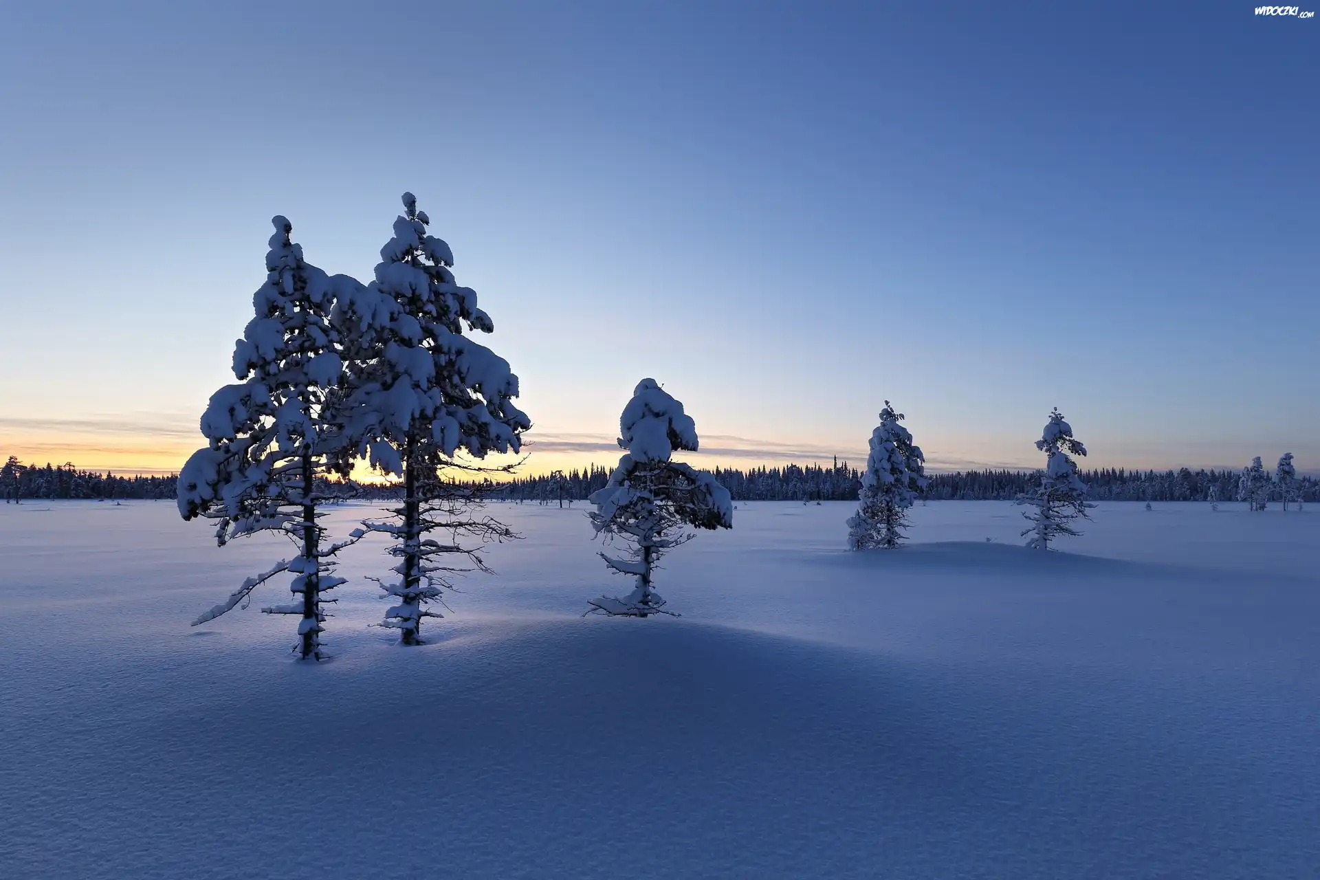 Zdjęcia, Finlandia, Laponia, Gmina Ylitornio, Zachód Słońca, Pola, Drzewa, Lasy, Zima