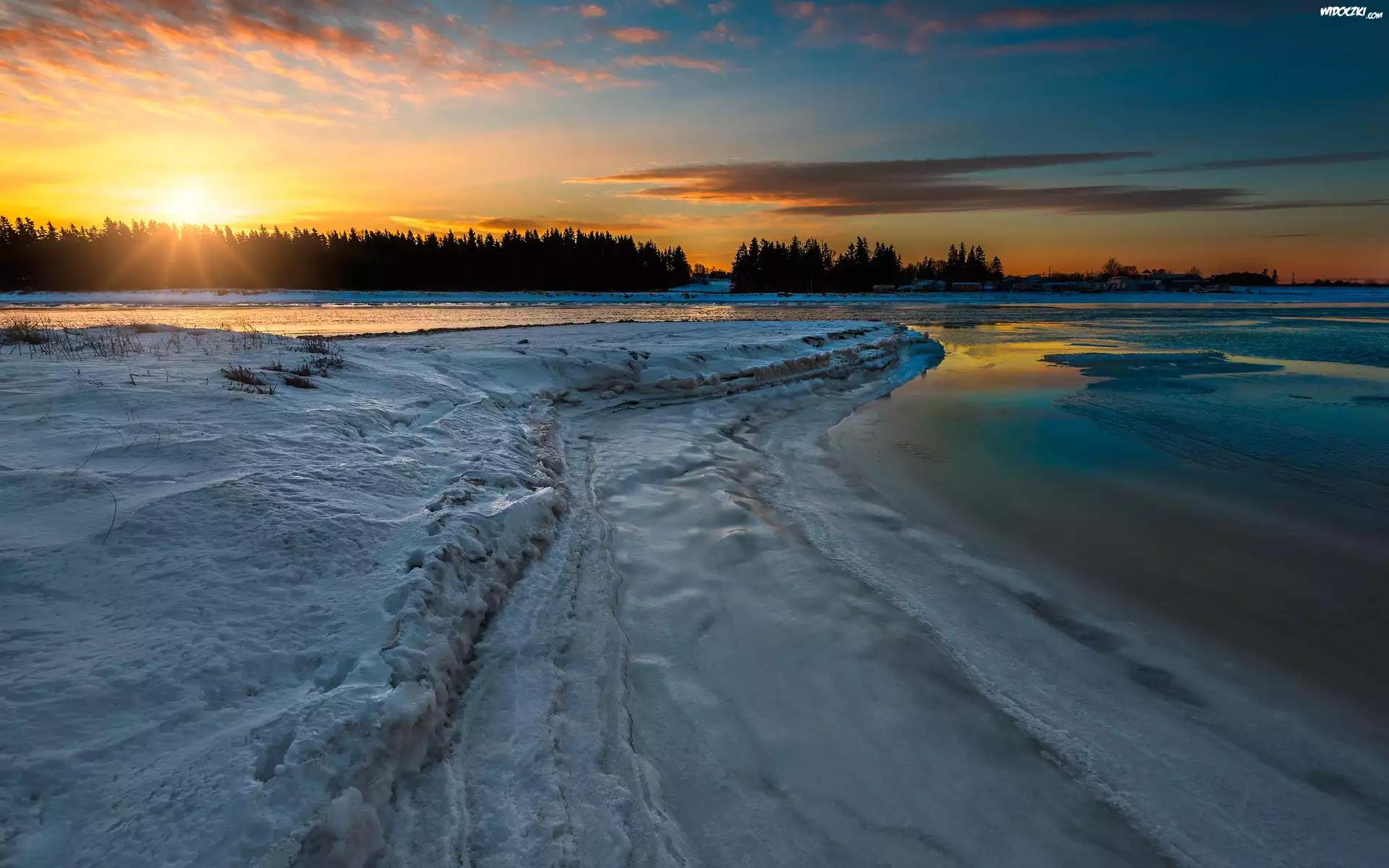 Zima, Las, Jezioro, Zachód słońca