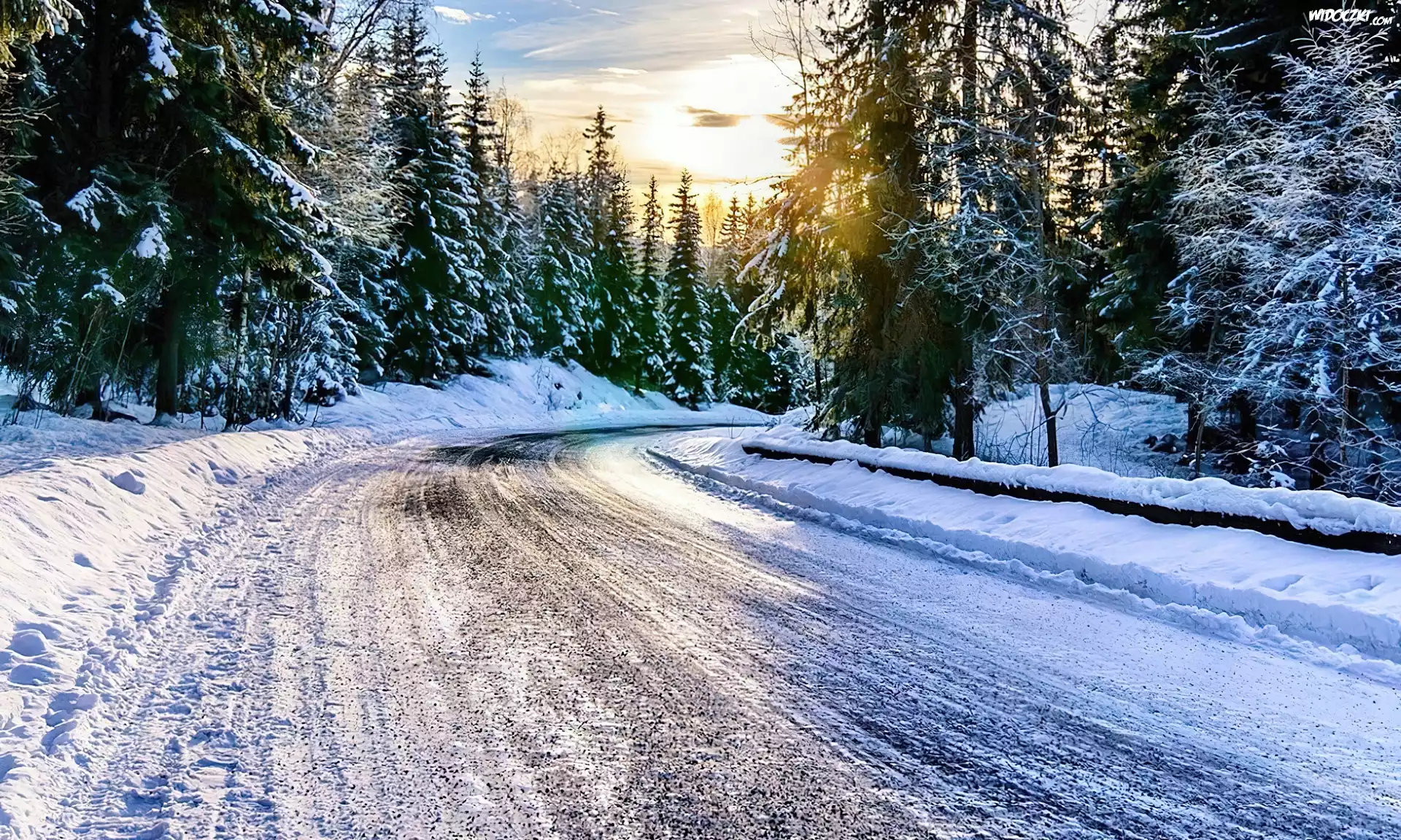 Zdjęcia, Zima, Droga, Las, Zachód, Słońca