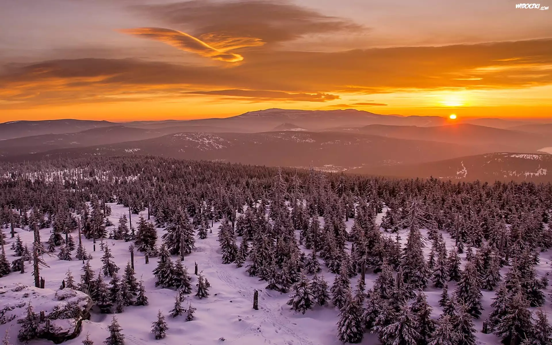 Zima, Góry, Lasy, Zachód Słońca