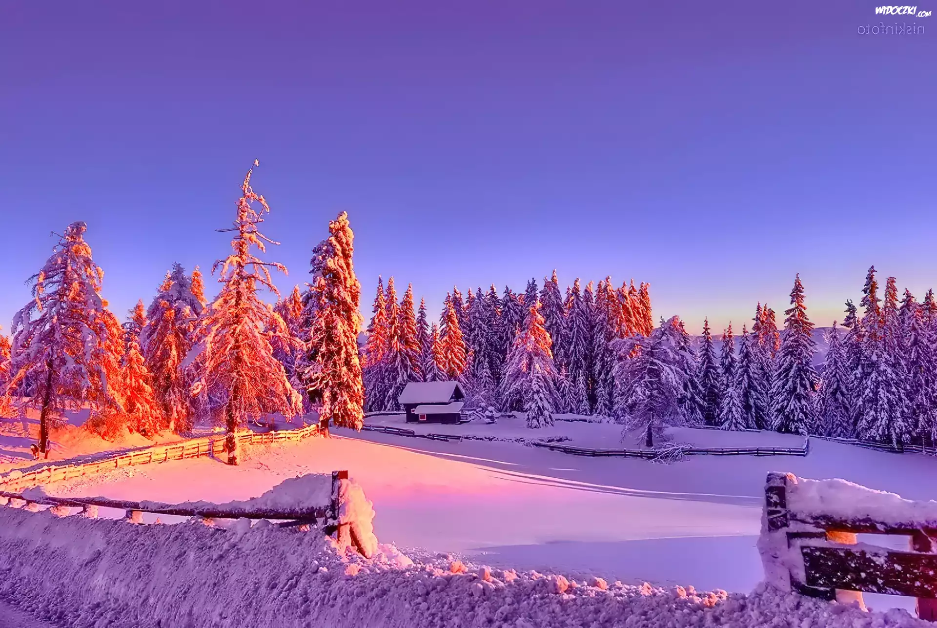 Zdjęcia, Zima, Las, Pola, Dom, Zachód Słońca