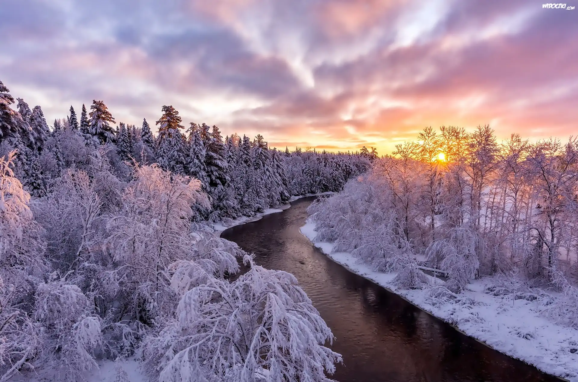 Zdjęcia, Zima, Las, Rzeka, Zachód Słońca