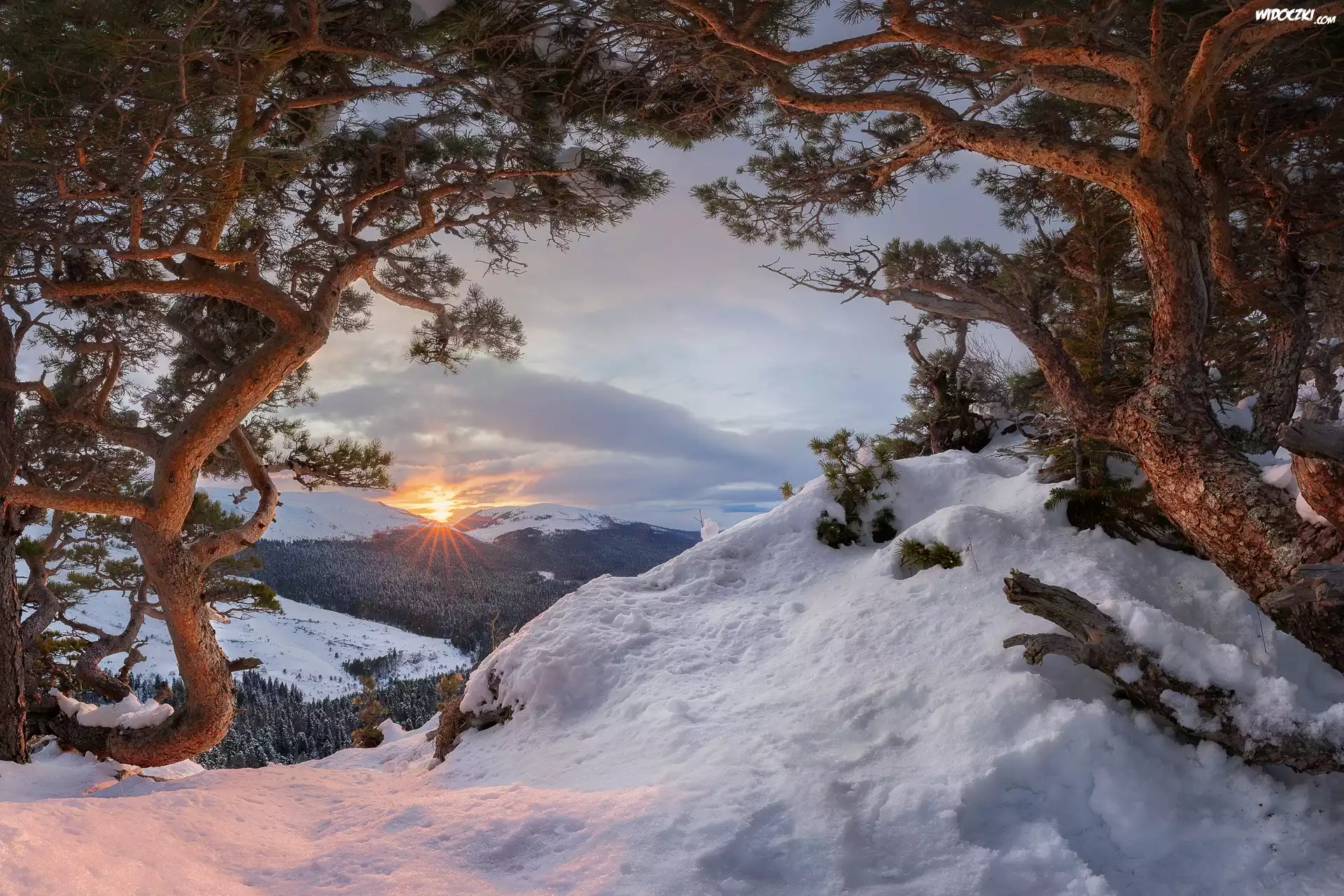 Zdjęcia, Zima, Góry, Śnieg, Drzewa, Sosna, Pnie, Gałęzie, Zaspy, Zachód słońca