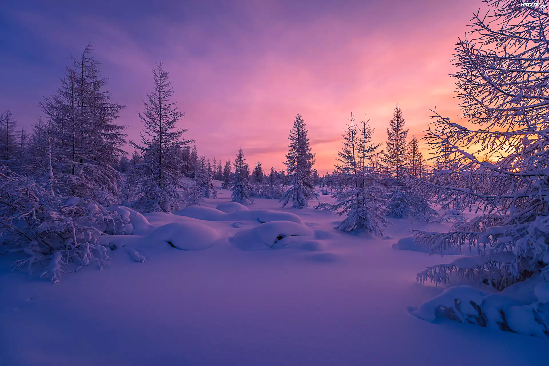 Zima, Las, Świerki, Zachód słońca