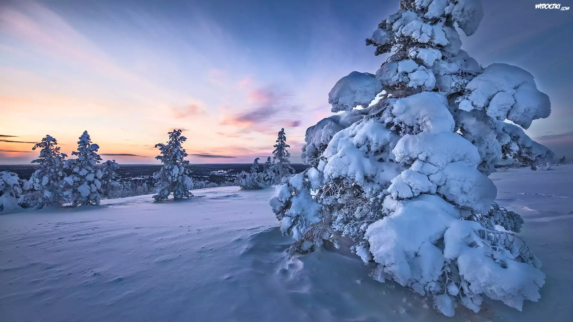 Zima, Ośnieżone, Świerki, Zachód słońca