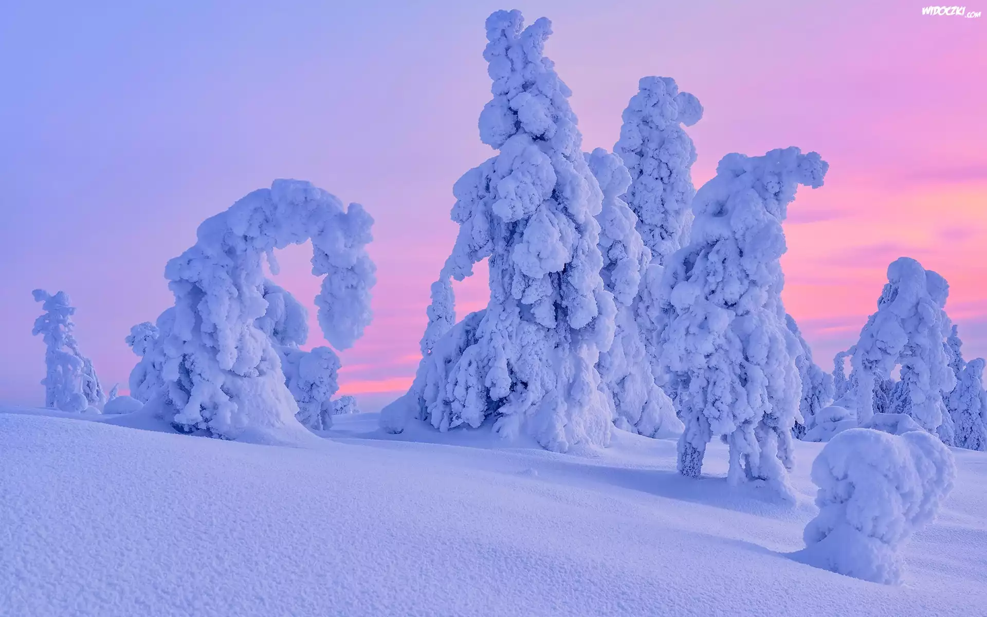 Zima, Zaśnieżone, Drzewa, Śnieg, Zaróżowione, Niebo