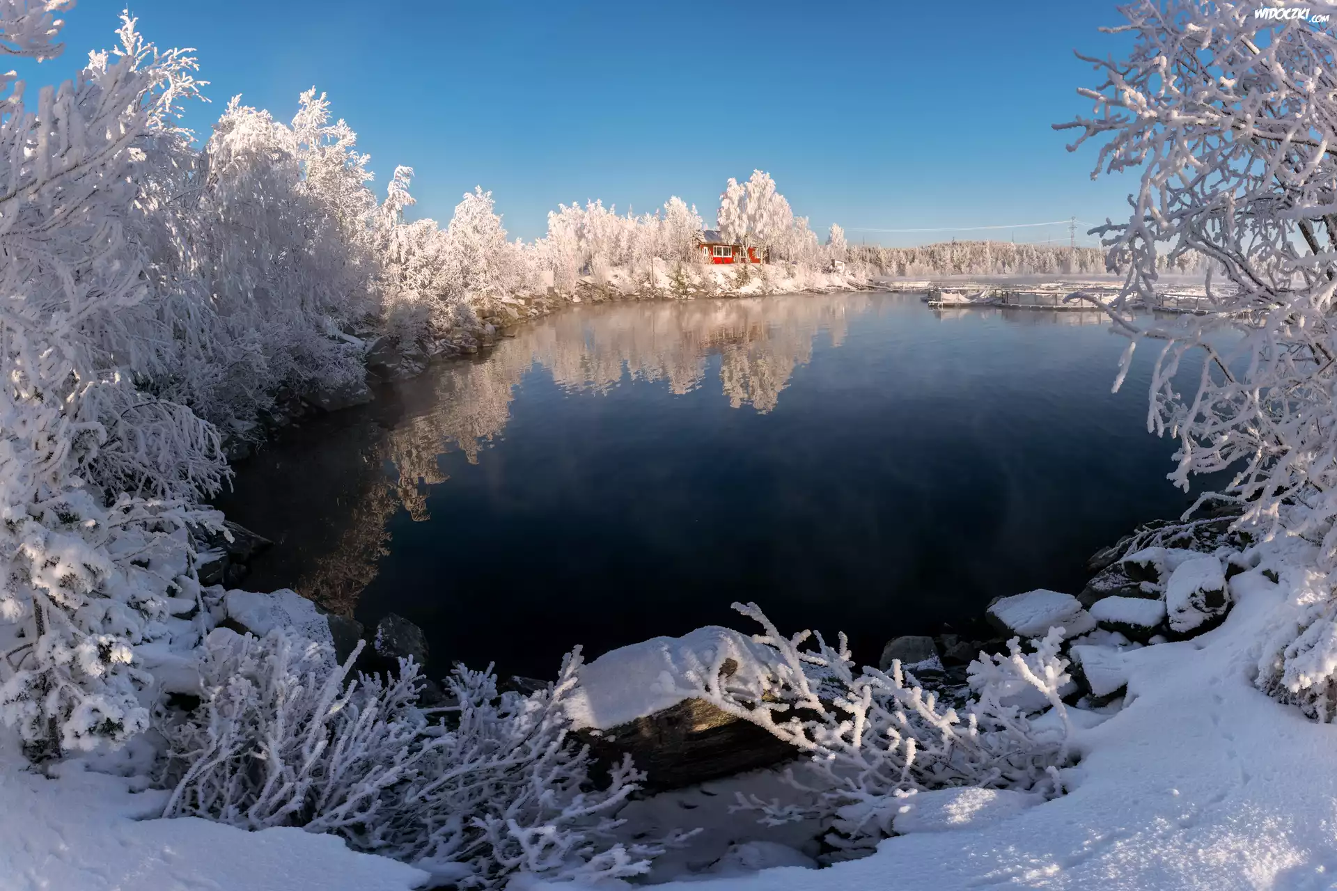 Zdjęcia, Zima, Jezioro, Dom, Zaśnieżone, Drzewa