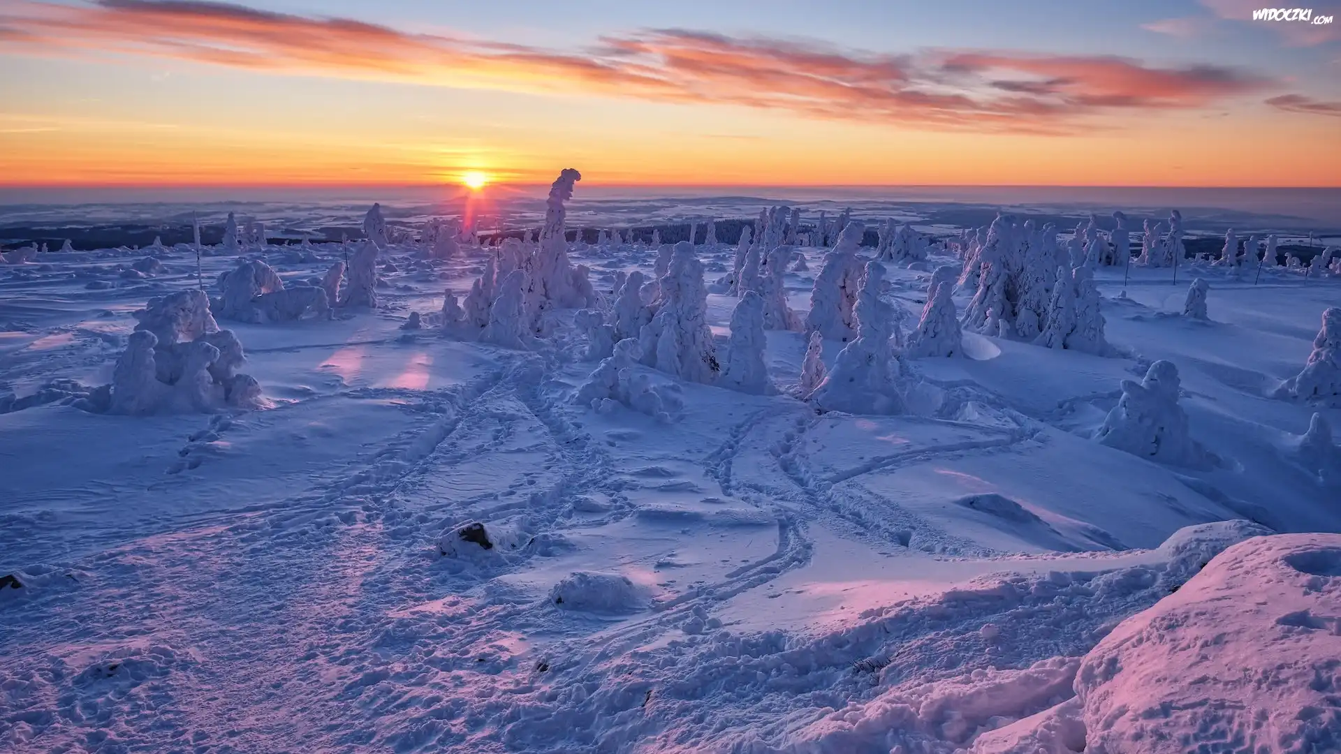Zima, Góry Jesioniki, Zaśnieżone, Krzewy, Śnieg, Roślinność, Wschód słońca, Polana, Kraj ołomuniecki, Czechy |