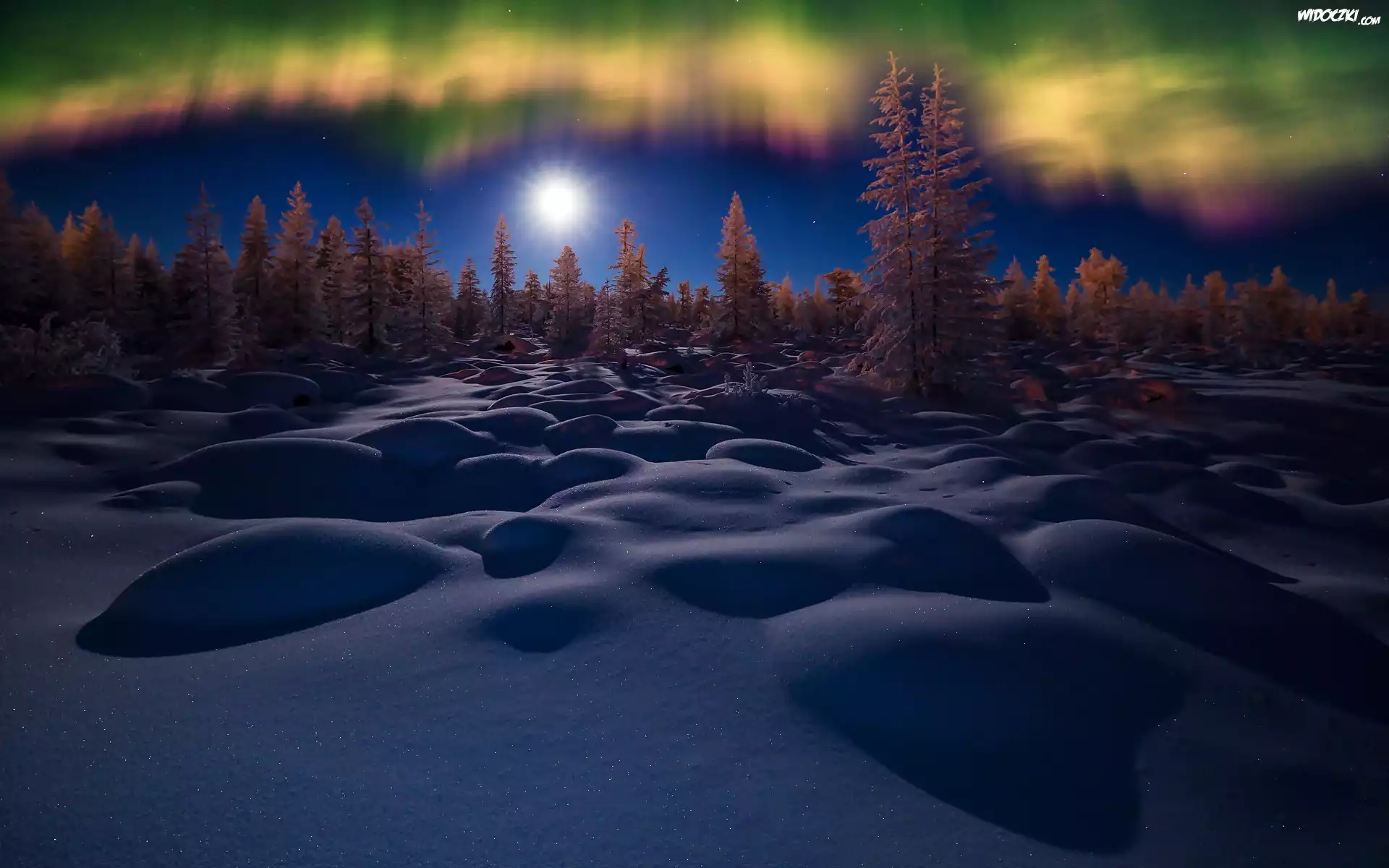 Zima, Śnieg, Pole, Drzewa, Zorza polarna
