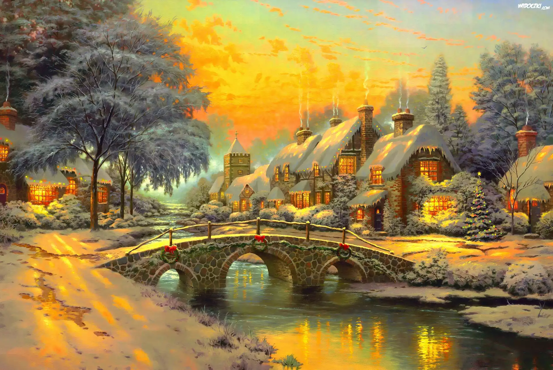 Zimowy, Widoczek, Domy, Most, Rzeka