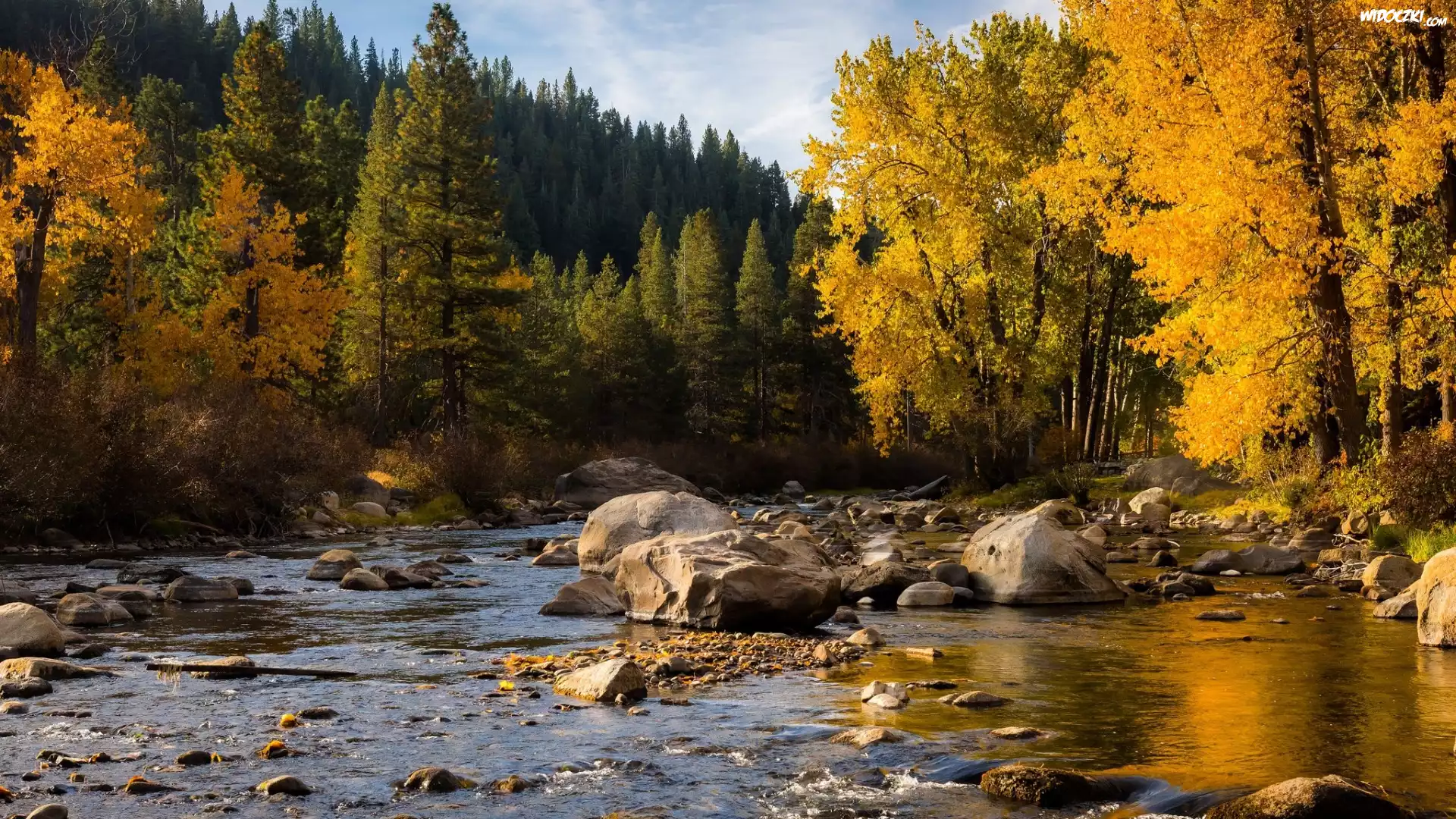 Zdjęcia, Stany Zjednoczone, Rzeka Truckee, Jesień, Kamienie, Las, Drzewa