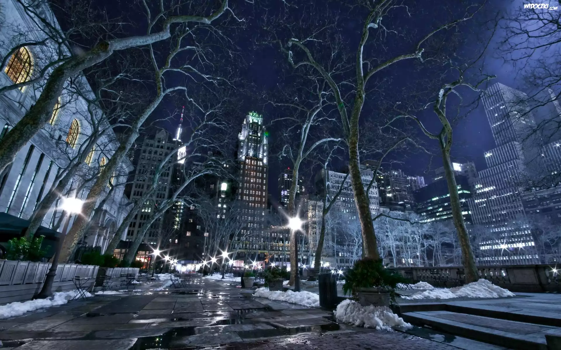 Stany Zjednoczone, Nowy Jork, Miasto, Noc, Zima, Drzewa