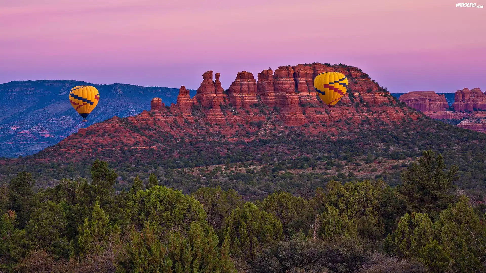 Balony, Skały, Góry, Drzewa, Sedona, Arizona, Stany Zjednoczone