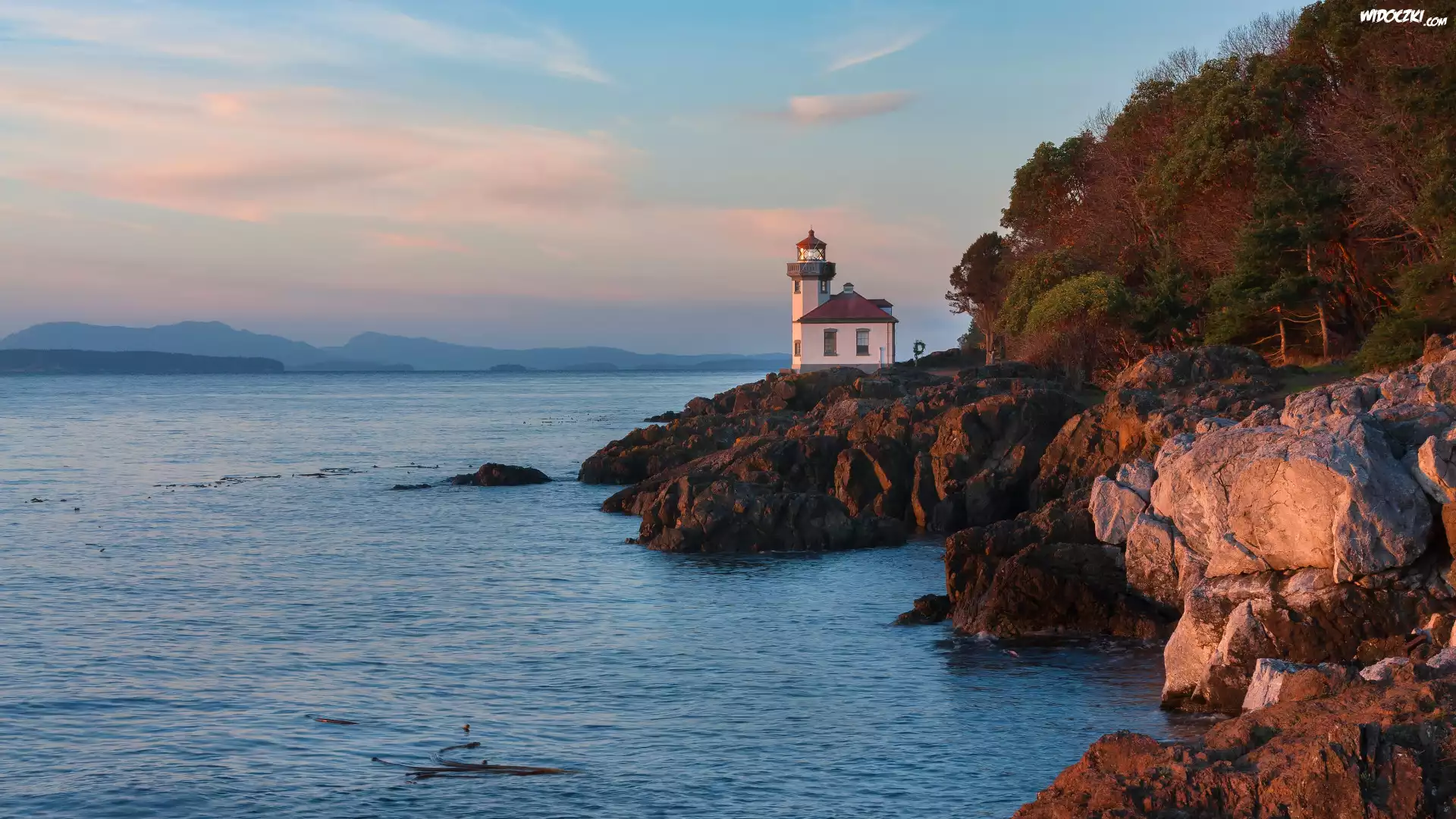 Morze, Brzeg, Skały, Latarnia morska, Drzewa, Niebo, Jesień, Lime Kiln Point State Park, Stan Waszyngton, Stany Zjednoczone |