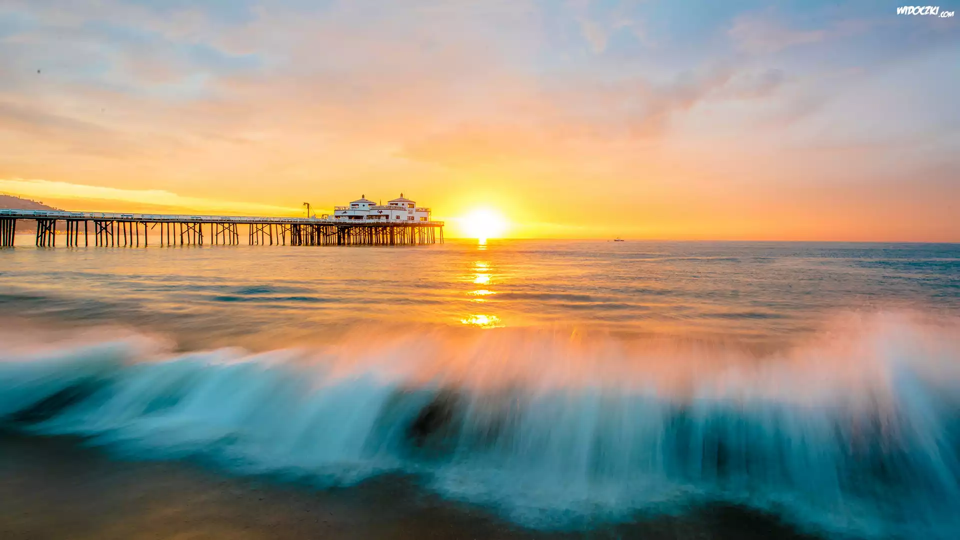 Zdjęcia, Zachód słońca, Morze, Molo, Malibu, Kalifornia, Stany Zjednoczone