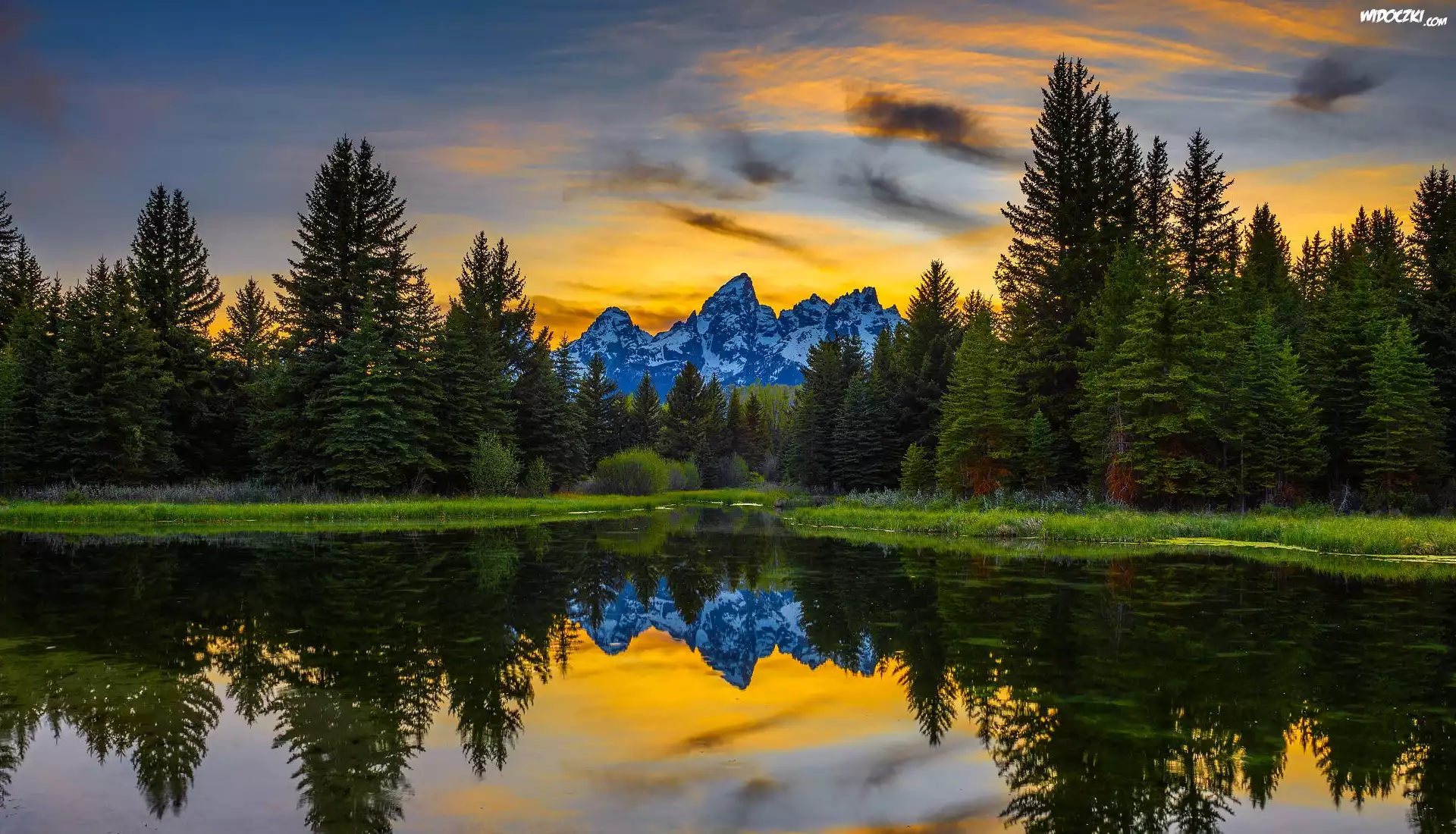 Zdjęcia, Drzewa, Góry, Teton Range, Rzeka, Snake River, Odbicie, Zachód słońca, Park Narodowy Grand Teton, Wyoming, Stany Zjednoczone