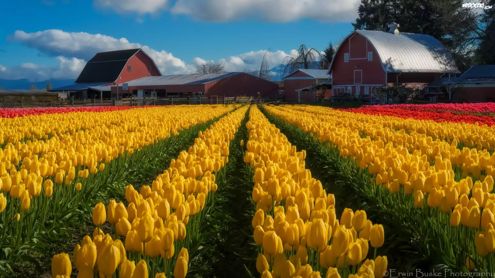 Zdjęcia, Plantacja, Tulipany, Pole, Domy, Skagit Valley, Stan Waszyngton, Stany Zjednoczone