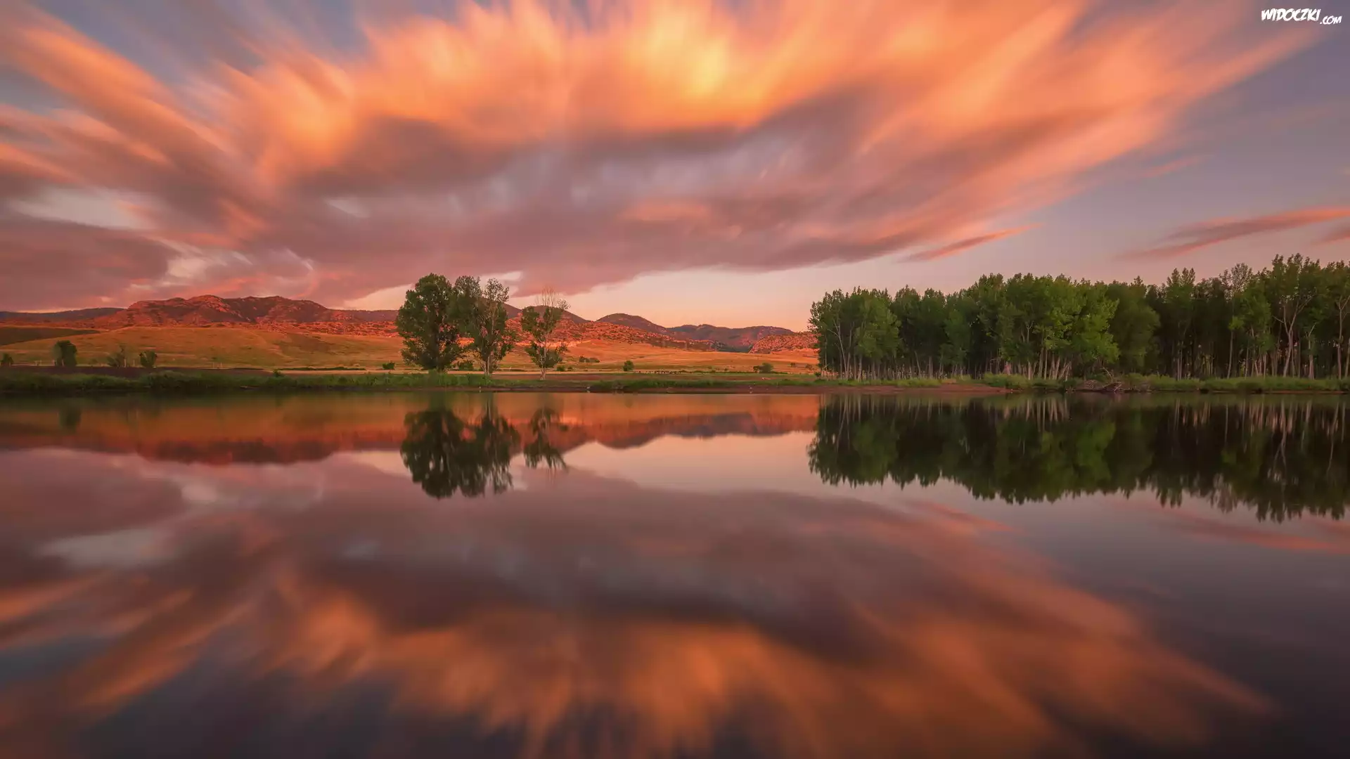Jezioro, Lake Chatfield, Wschód słońca, Drzewa, Chmury, Kolorado, Stany Zjednoczone