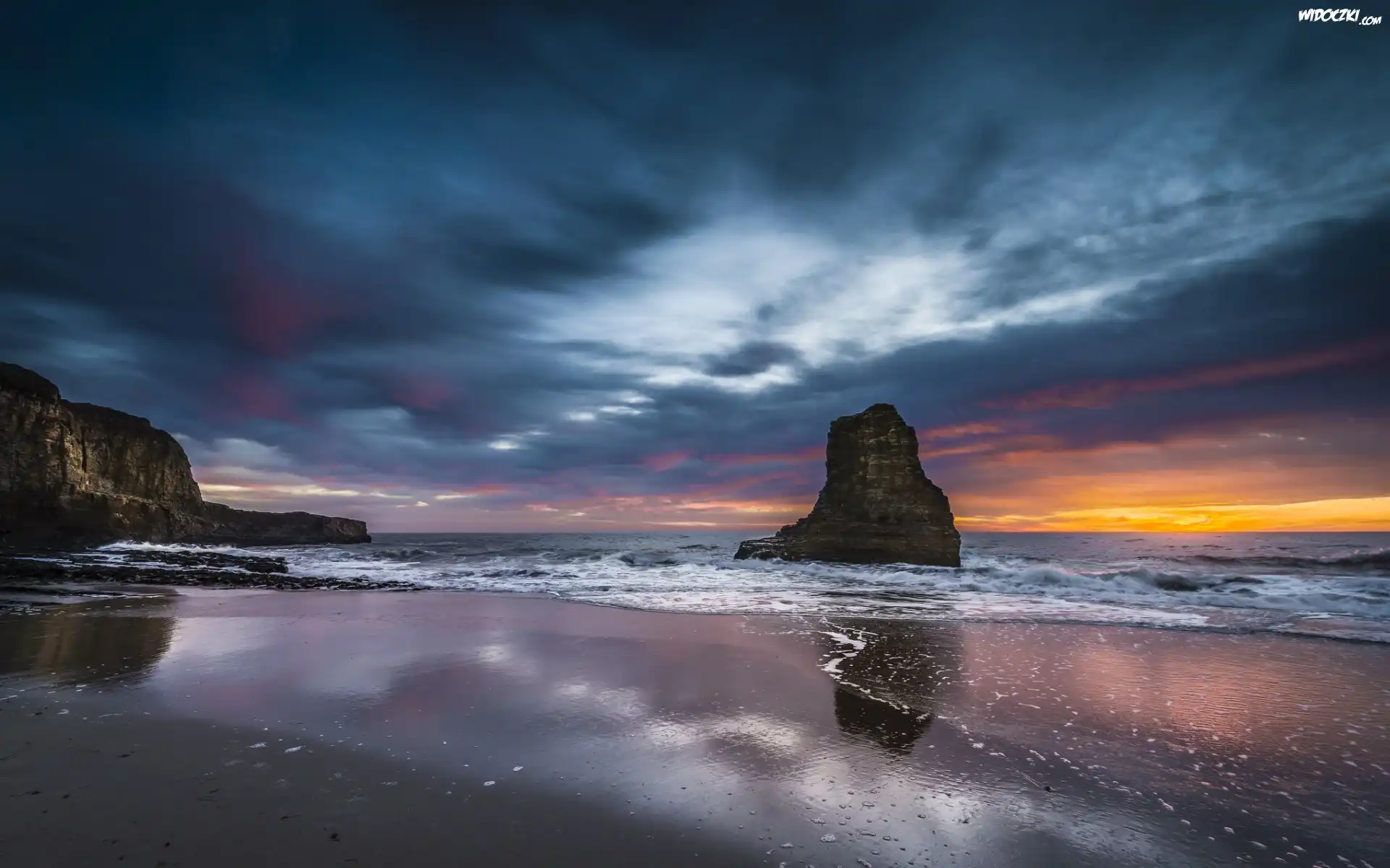 Stany Zjednoczone, Kalifornia, Morze, Plaża, Skały, Zachód Słońca