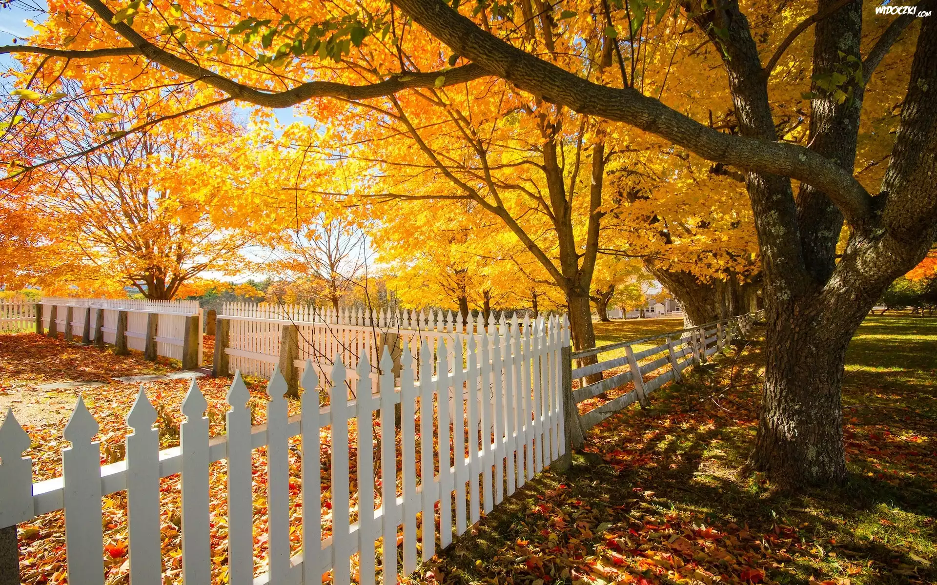 Jesień, Drzewa, Ogrodzenie, Shaker Village, Canterbury, New Hampshire, Stany Zjednoczone
