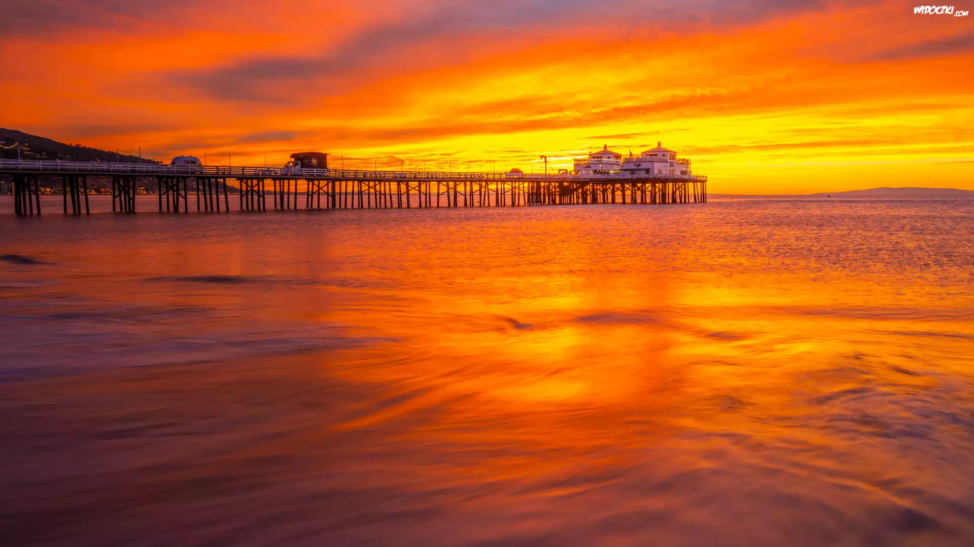 Zdjęcia, Molo, Morze, Wschód słońca, Malibu, Kalifornia, Stany Zjednoczone