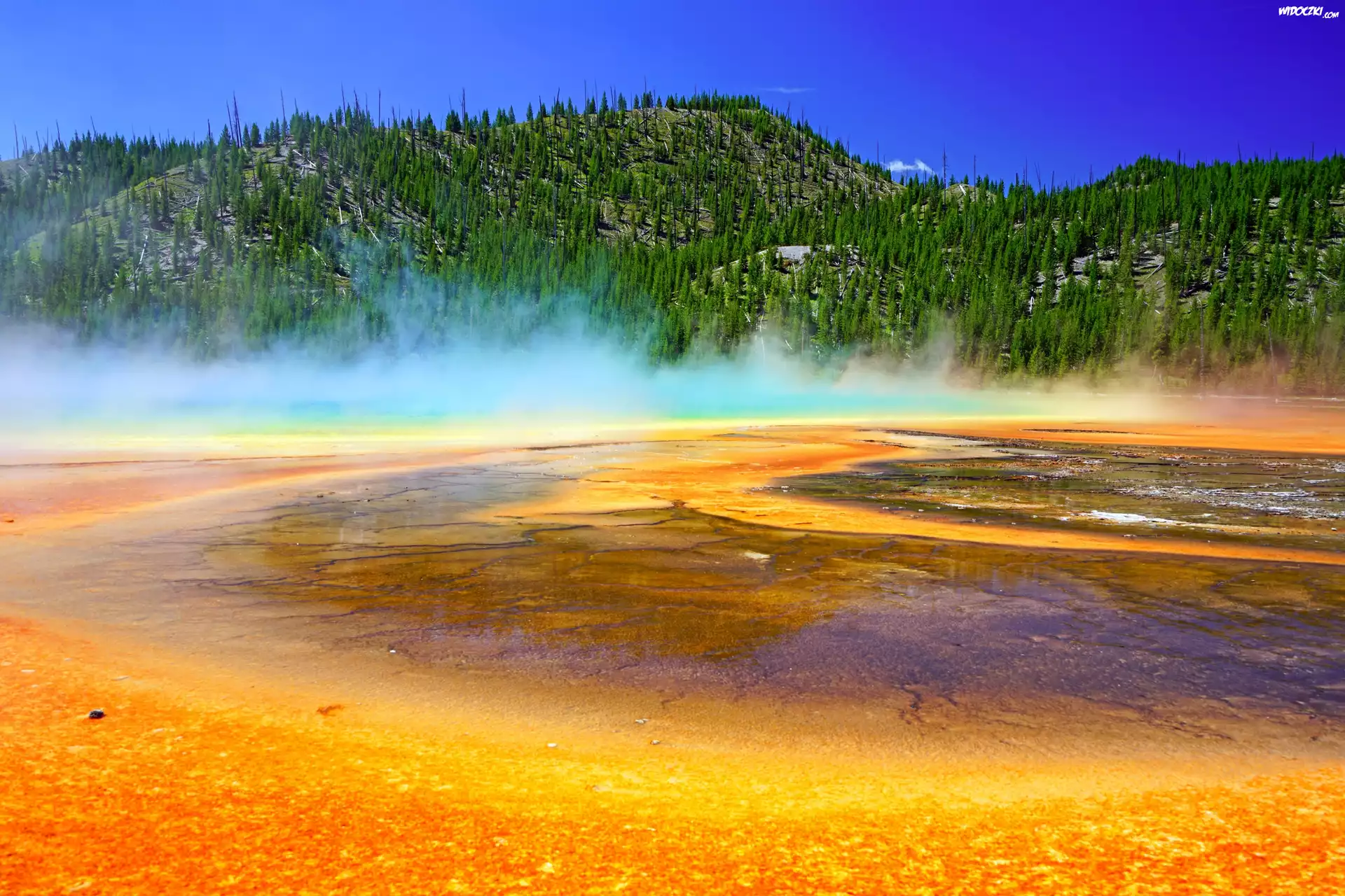 Zdjęcia, Park Narodowy Yellowstone, Gorące źródło, Opary, Las, Stany Zjednoczone