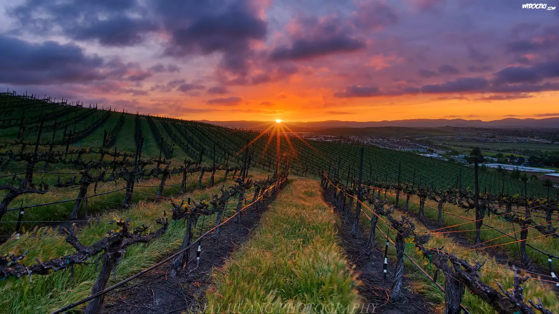 Plantacja, Winogron, Zachód słońca, Chmury, Livermore, Kalifornia, Stany Zjednoczone