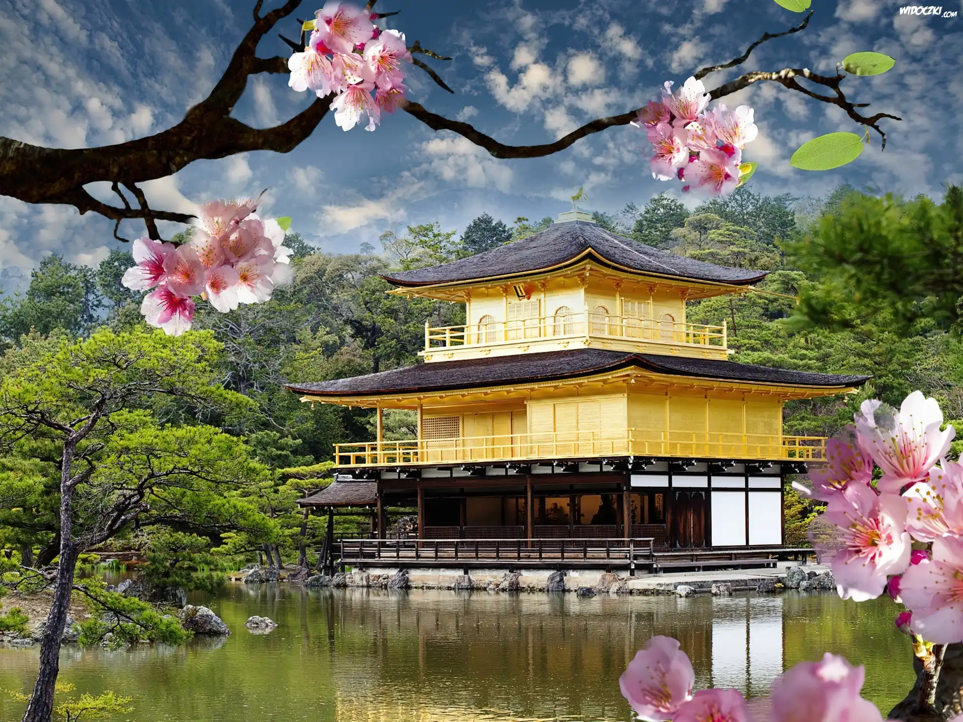 Zdjęcia, Świątynia Kinkakuji, Złoty Pawilon, Staw Kyko chi, Drzewa, Kioto, Japonia, Okwiecone, Gałązki