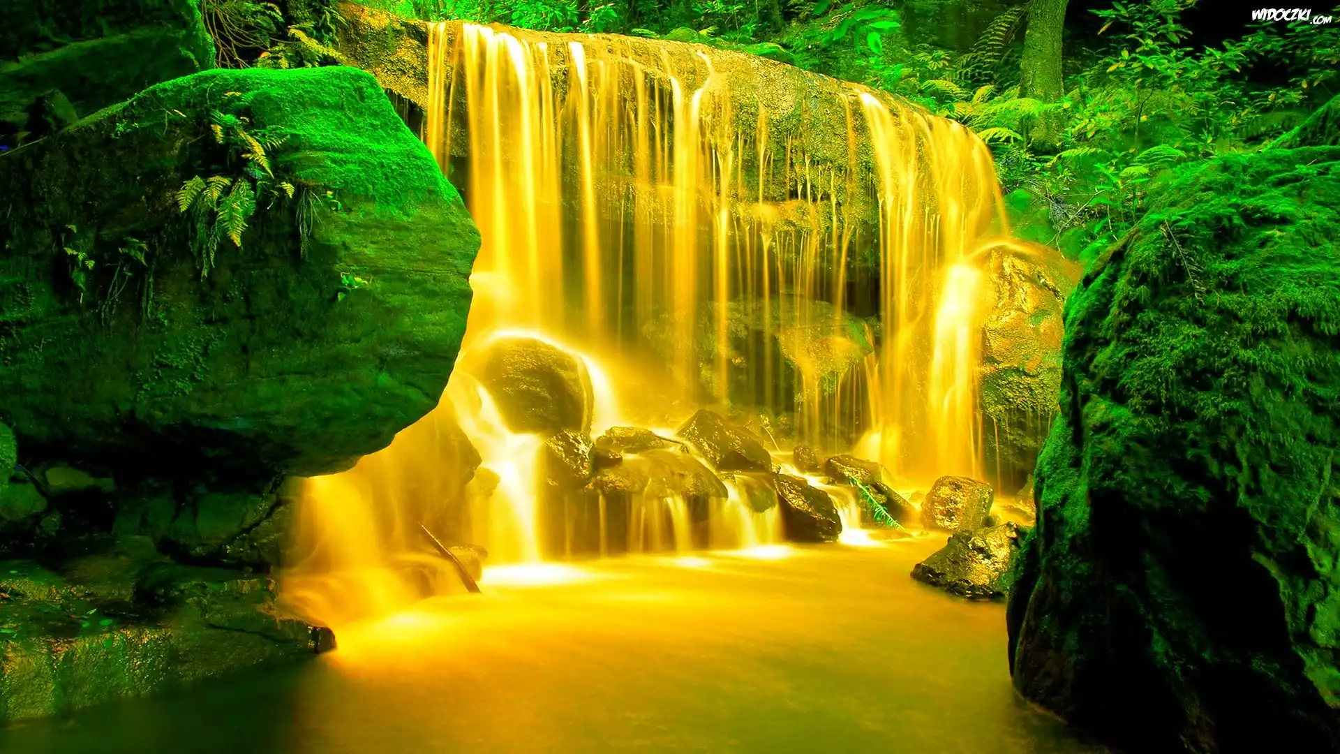 Zdjęcia, Złoty, Wodospad, Zielone, Skały