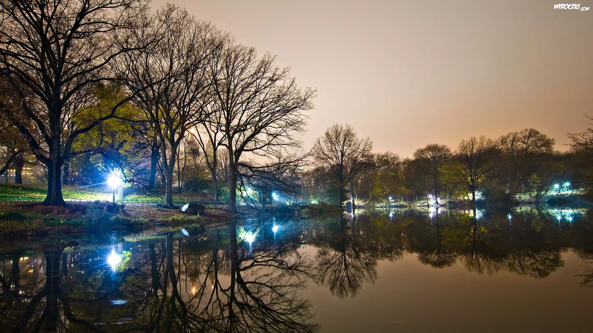 Zdjęcia, Zmierzch, Oświetlony, Park, Jezioro