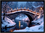 Zima, Most, Rzeka, Lampy, Drzewa, Åšnieg, Domy, Zmrok