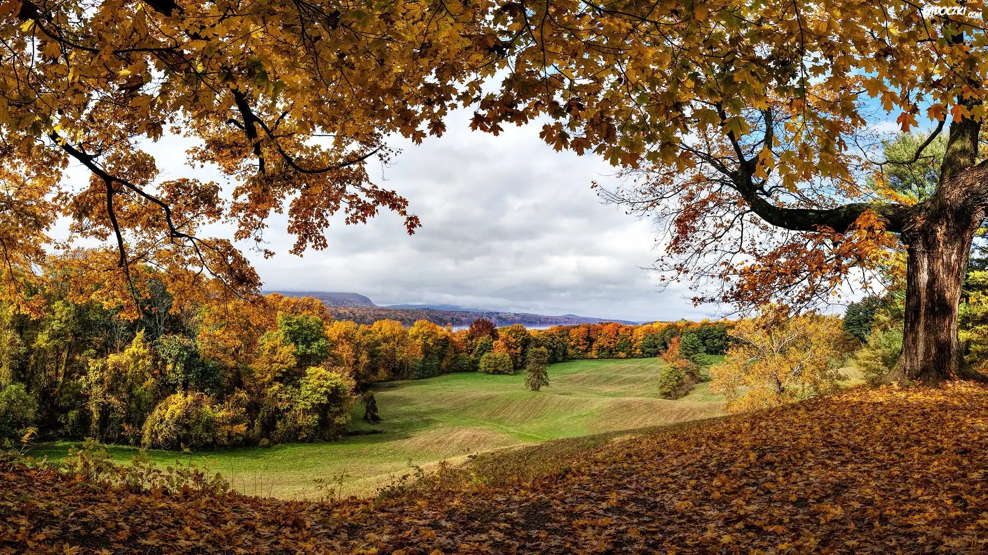 Zdjęcia, Jesień, Żółte, Drzewa, Liście, Łąka