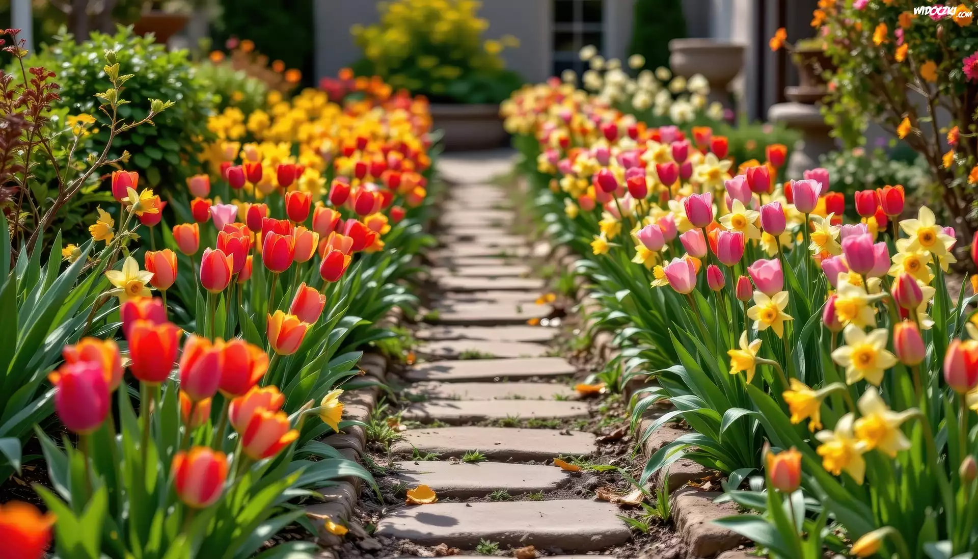 Zdjęcia, Kwiaty, Tulipany, Narcyzy żonkile, Ścieżka, Ogród
