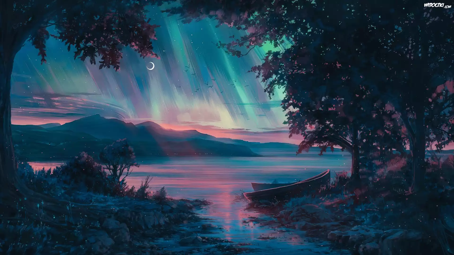 Grafika, Jezioro, Góry, Zorza polarna, Drzewa, Łódki