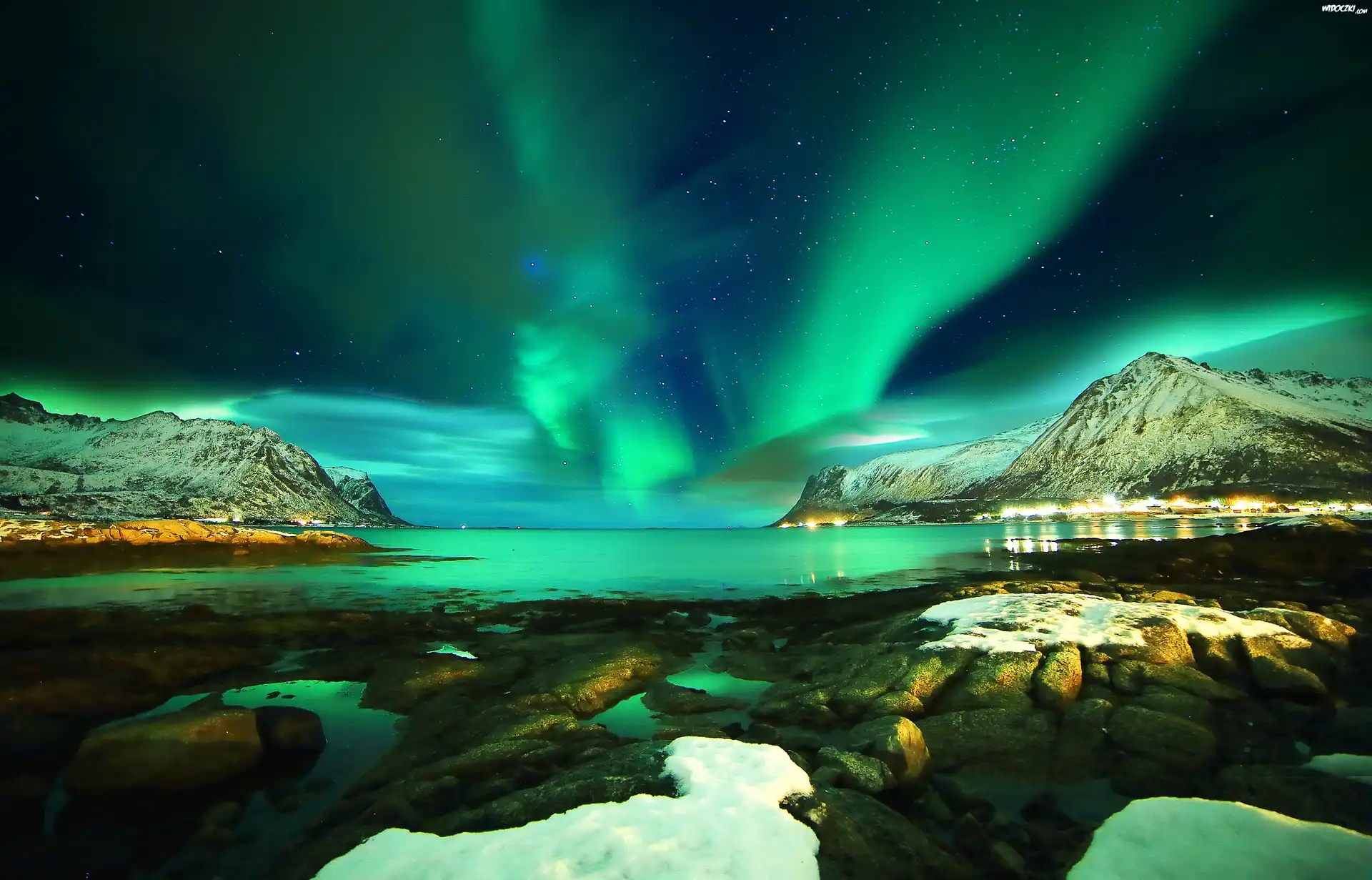 Zdjęcia, Zorza, Polarna, Góry, Jezioro, Zima