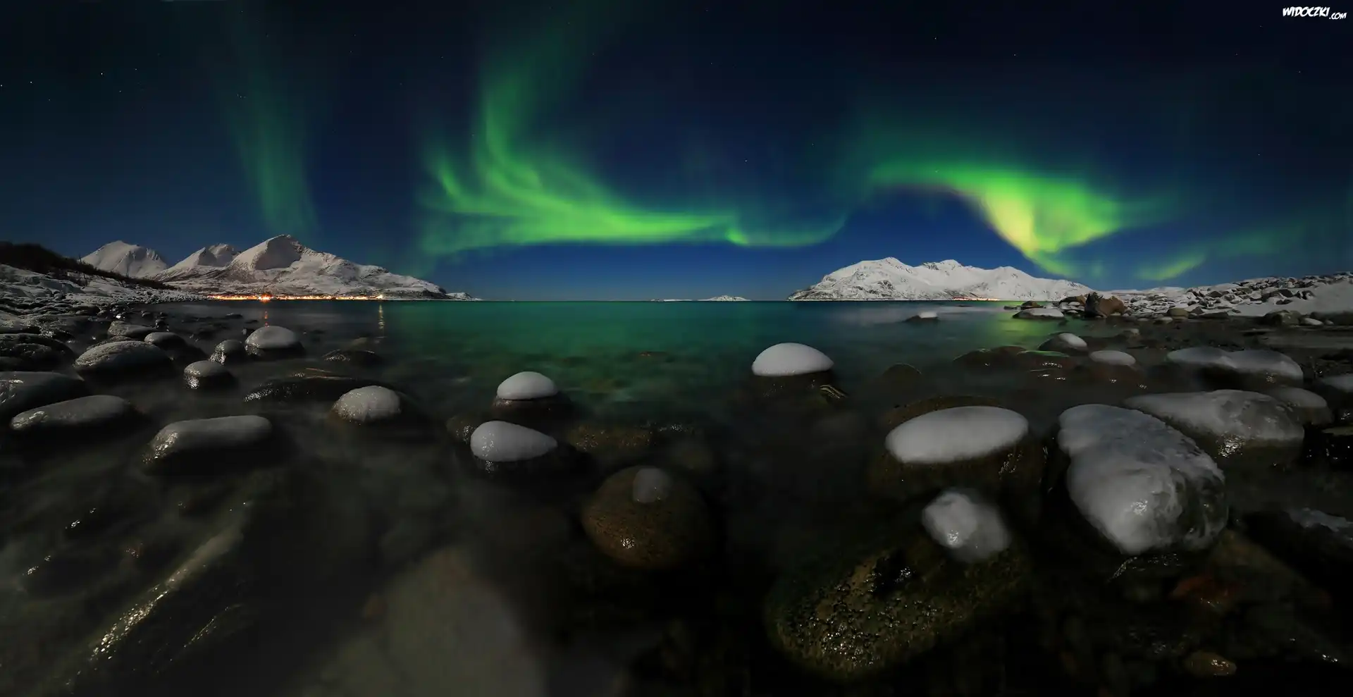 Zdjęcia, Zorza polarna, Kamienie, Woda