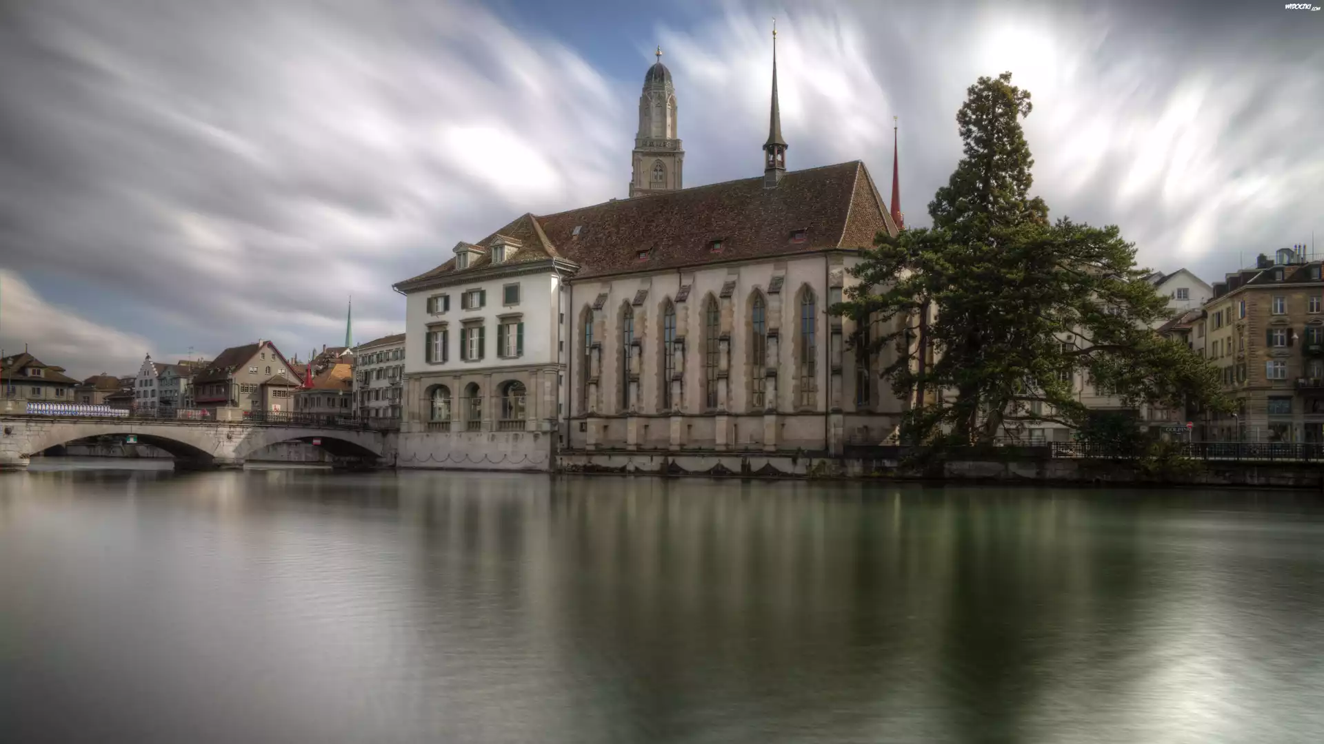 Zdjęcia, Szwajcaria, Zurych, Wieża Katedry Grossmunster, Rzeka Limmat